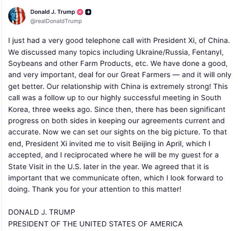 When you understand this context, Trump’s post about the call is genuinely hilarious. While China was attempting the most significant reframing of US-China foundational narrative in fifty years, Trump came away thinking the highlight was agricultural trade 🤣
